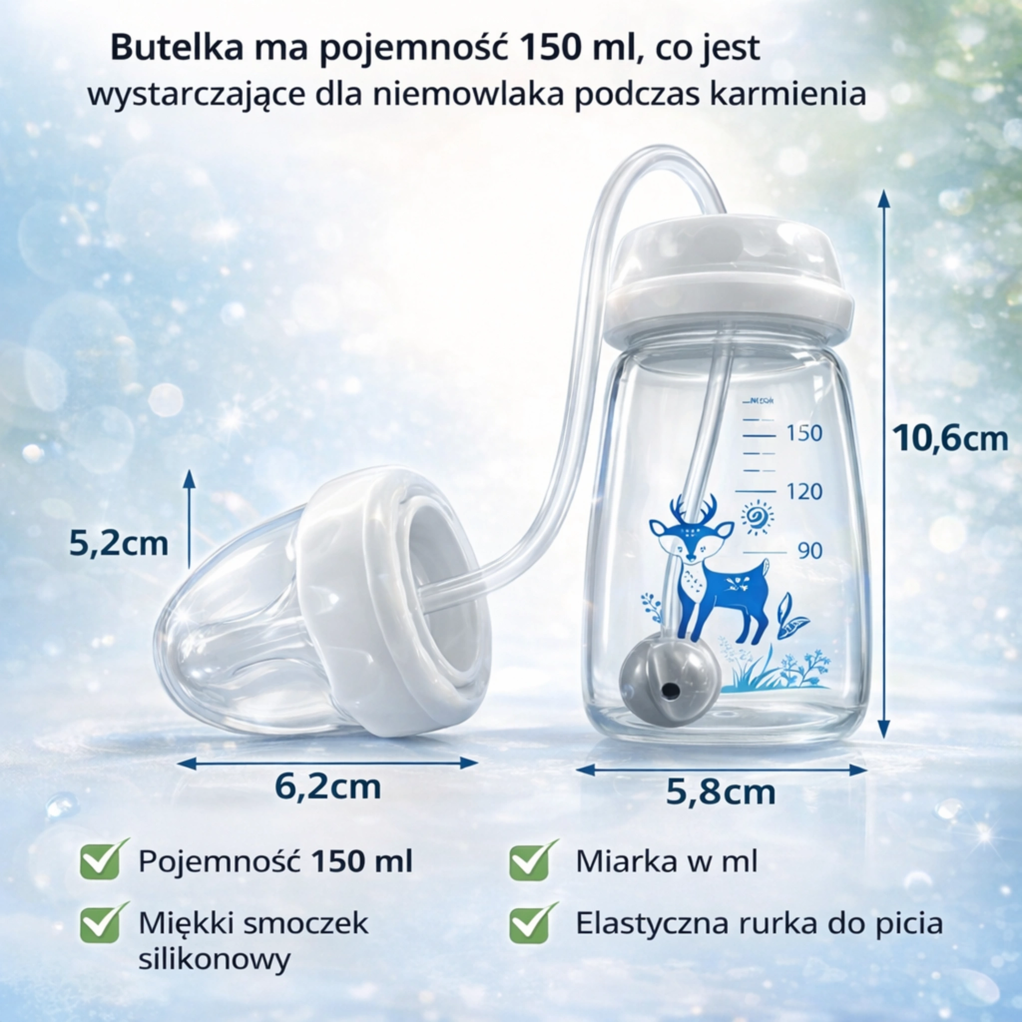 Butelka ma pojemność około 150 ml, co w większości przypadków jest wystarczające dla niemowlaka podczas jednego karmienia oraz nauki samodzielnego picia.