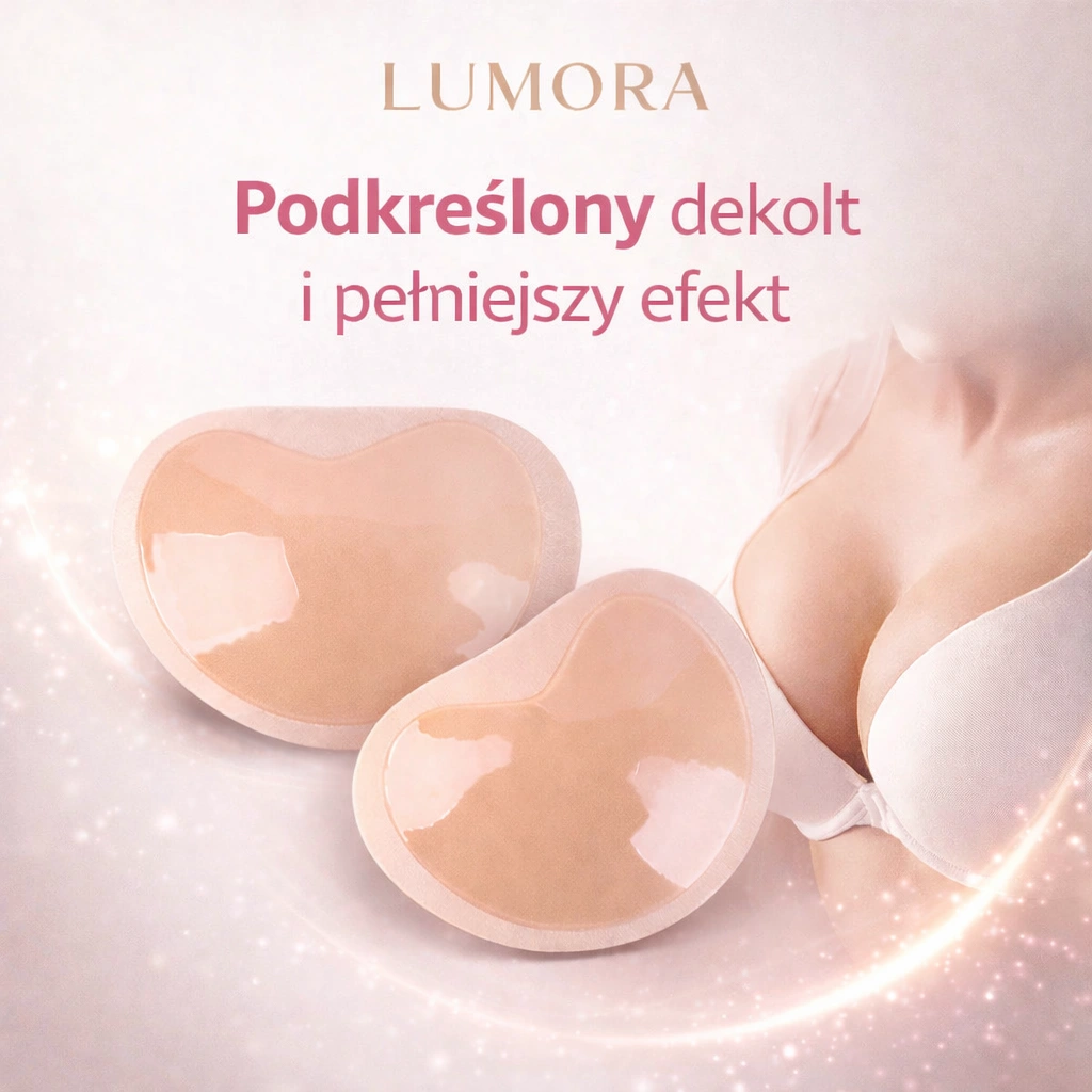 LUMORA to szybki sposób na pełniejszy i ładniej zarysowany dekolt — bez zmiany stanika i bez kombinowania. Delikatnie unoszą i modelują biust, dzięki czemu ubrania leżą lepiej, a linia dekoltu wygląda równo i estetycznie. Sprawdzają się w topach i sukienkach (także bez ramiączek) oraz w bikini, kiedy zależy Ci na naturalnym efekcie i komforcie bez ciągłego poprawiania.