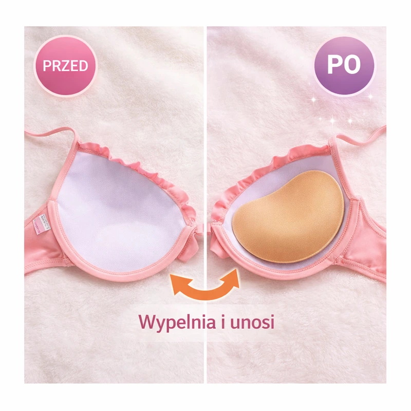 LUMORA dodaje objętości dokładnie tam, gdzie jej brakuje — w dolnej i bocznej części miseczki. Dzięki temu biust wygląda pełniej, jest delikatnie uniesiony i lepiej zebrany, a dekolt robi się bardziej kobiecy i proporcjonalny. Wkładki pomagają też, gdy miseczka lekko odstaje — wypełniają ją i poprawiają ułożenie stanika. Efekt jest natychmiastowy: zakładasz, dopasowujesz i gotowe — bez operacji, bez taśm i bez kombinowania.